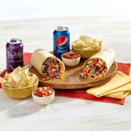 730 Cal. Seasoned bean, nacho cheese sauce, seasoned rice, fiesta strips, creamy chipotle sauce, reduced-fat sour cream, and three-cheese blend wrapped inside a warm flour tortilla, with even more three-cheese blend grilled on the top.